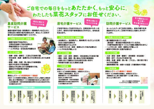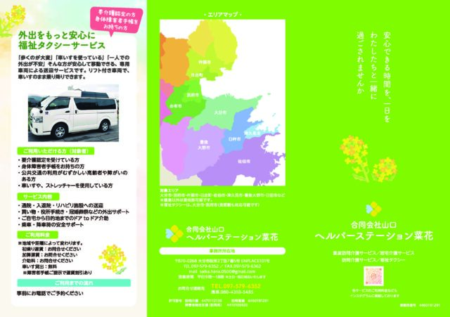 大分県でサービスを展開されている ヘルパーステーション菜花様のロゴマークデザインと、リーフレットのデザイン制作~印刷までさせていただきました。