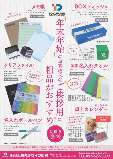 ここ数年は徐々に年賀状を作られる企業様も減ってきており寂しい限りですが、代わりに増えているのが年末年始にお得意先様にご挨拶に伺った際の粗品として、また、郵送などで年末に送る用のグッズとして、オリジナルのメモ帳や卓上カレンダー、BOXティッシュなどを作られるお客様が増えてきています。